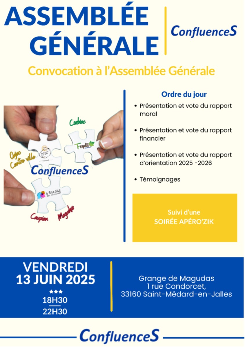ASSEMBLEE GENERALE CONFLUENCES Christian BAL • 27 mai 2025 Calendrier Ajouter au calendrier Ajouter au calendrier Timely Ajouter à Google Ajouter à Outlook Ajouter au calendrier Apple Ajouter à un autre calendrier Exporter vers XML Quand : 13 juin 2025 @ 14:19 2025-06-13T14:19:00+02:00 2025-06-13T14:34:00+02:00 AG CONFLUENCES à l'ESCALE DES POSSIBLES (Magudas)
