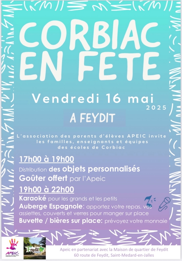 Agitateur d’initiatives et tisseur de solidarité, l’ESPACE DE VIE SOCIALE FEYDIT-CONFLUENCES propose toute l’année pour tous publics des animations favorisant le « vivre ensemble » et le « faire ensemble » sur le quartier de Corbiac (St Médard en Jalles)