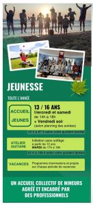 Cet espace d’accueil pour les jeunes de 13 à 16 ans est un lieu d’échange, d’émergence de projets et d’activités variées. Avec l’accompagnement d’un animateur permanent, ce sont les jeunes avec ce qu’ils sont, ce dont ils ont envie qui deviennent « créateurs et acteurs » de leurs temps de loisirs.
